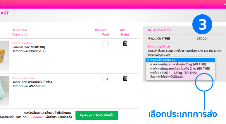 เลือกค่าขนส่ง เช่น พัสดุธรรมดา ลงทะเบียน ems หรือ ติดต่อเจ้าหน้าที่