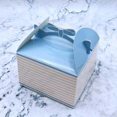 กล่องทรงสี่เหลี่ยมผืนผ้า ตั้งอยู่ทรง กระดาษหนา หูเกี่ยวปิด 2 ข้าง หูหิ้วกลาง สำหรับบรรจุคุกกี้หรือ ดัดแปลงใช้เป็นกล่องของขวัญ ได้