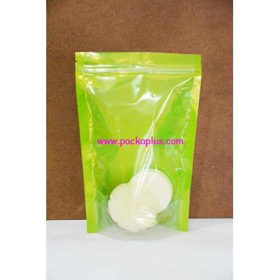 ถุงใส่คุกกี้ มีฐานตั้่งได้ ด้านหน้าพลาสติกใส ไม่มีลาย สามารถมองเห็นขนมภายใน พื้นหลังสี silver เนื้อฟอยด์ มี ziplock ปิดปากถุงขนมแน่น ใส่คุกกี้ได้ ประมาณ 300-350 g