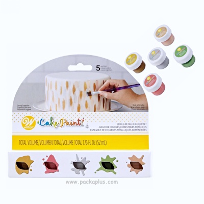 Paint fancy accents on your cakes with this edible metallic paint Total net weight: 1.76 fl. oz. (52 ml) Quantity: 5 jars, about 0.35 oz. each
