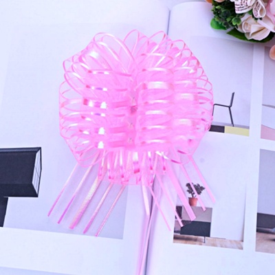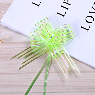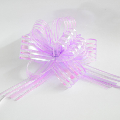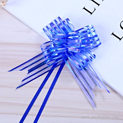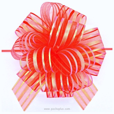Pull Bow โบว์ดึงสำเร็จรูป เนื้อผ้าไนล่อน เดินเส้นรุ้ง 5 เส้น ทรงตะกร้อ มีหาง ขนาดเส้นผ่าศูนย์กลาง 5 นิ้ว หลังดึงเป็นรูปโบว์แล้ว ความกว้างของเส้นโบว์ 3.2 cm มีให้เลือก 6 สี ทอง, เงิน, ชมพูอ่อน, เขียวสว่าง, ม่วงอ่อน และ แดง