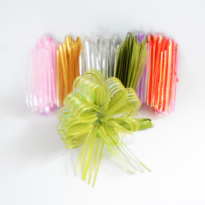 Pull Bow โบว์ดึงสำเร็จรูป เนื้อผ้าไนล่อน เดินเส้นรุ้ง 5 เส้น ทรงผีเสื้อ มีหาง ขนาดโบว์หลังดึงเป็นรูปโบว์แล้ว 9x14 cm ความกว้างของเส้นโบว์ 3.2 cm มีให้เลือก 13 สี ขาว, ทอง, เงิน, ชมพูอ่อน, ชมพูสว่าง, บานเย็น, เขียวสว่าง, เขียวขี้ม้า, ม่วงอ่อน, ส้ม, น้ำเงินฟ้า, เหลือง และ แดง