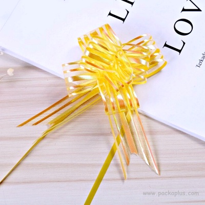 Pull Bow โบว์ดึงสำเร็จรูป เนื้อผ้าไนล่อน เดินเส้นรุ้ง 5 เส้น ทรงผีเสื้อ มีหาง ขนาดโบว์หลังดึงเป็นรูปโบว์แล้ว 9x14 cm ความกว้างของเส้นโบว์ 3.2 cm มีให้เลือก 13 สี ขาว, ทอง, เงิน, ชมพูอ่อน, ชมพูสว่าง, บานเย็น, เขียวสว่าง, เขียวขี้ม้า, ม่วงอ่อน, ส้ม, น้ำเงินฟ้า, เหลือง และ แดง