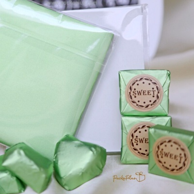 Embossed Aluminum Foil+Paper - ฟอยล์ห่อช็อคโกแลต ด้านหลังเพิ่มซ้อนกระดาษ 1 ชั้น ฟอยล์ห่อช็อคโกแลต เนื้อพรีเมี่ยม มี texture *แผ่นอลูมิเนียมฟอยล์สีโทนกึ่งด้านกึ่งเงา Embossed Aluminum Foil Wrapper *แผ่นฟอยด์ คุณภาพดี เนื้อแผ่นลายสีสวยออกโทนกึ่งด้าน *ใช้สำหรับห่อ ลูกอม, ช็อคโกแลต และขนมต่างๆ *ด้านหน้า เป็นสีตามที่เลือก ด้านหลังมีกระดาษ ซ้อนเพิ่ม 1 ชั้น ช่วยในการห่อขนมง่ายขึ้น และช่วยกันซึม นน 70g