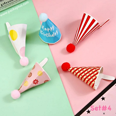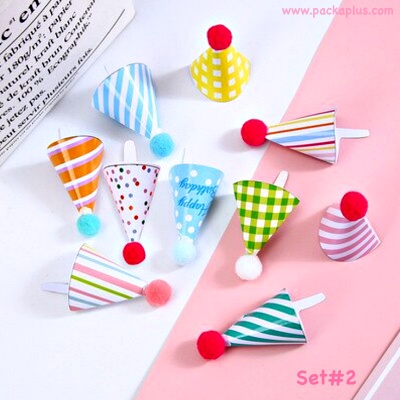 Party Cake Topper ป้ายปักเค้ก Happy Birthday DIY ทรงหมวก เซ็ตคละ แบบและน่ารักมากๆ (ตามรูป) วัสดุ: กระดาษแข็ง คุณภาพดี สีสวย พิมพ์ลายน่ารัก บรรจุแพคละ 1 แผ่น (10 ลายๆละ 1ชิ้น) ขนาดประมาณ : 2.3x4 cm ---> Party Cake toppers แผ่นป้ายปัก คัพเค้ก คุกกี้ ขนมต่างๆ ในงานปาร์ตี้น่ารักๆ