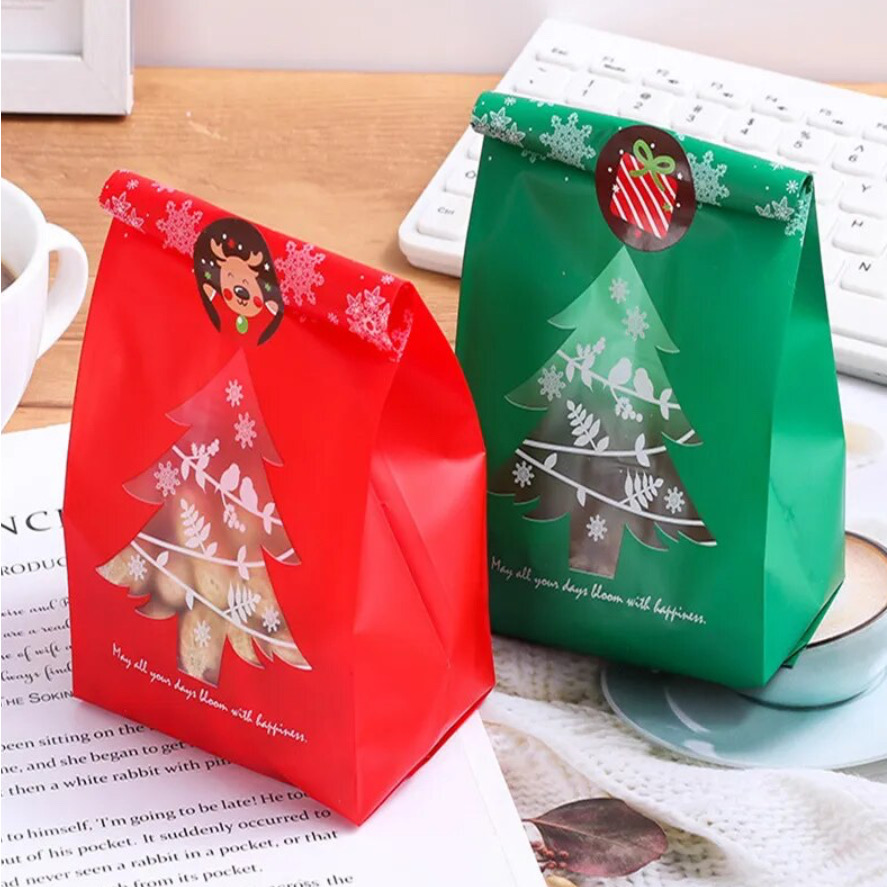 ถุงพลาสติก ลาย XMAS Tree คละสี แดงเขียว พร้อมสติกเกอร์ น่ารัก คละลาย ในเซ็ต วัสดุ พลาสติก food grade เนื้อหนา มีหน้าต่างใสเป็นรูปต้นคริสต์มาส แพคละ 20 sets สำหรับบรรจุคุกกี้ ขนมต่างๆ ของขวัญ ในเทศกาลคริสต์มาส