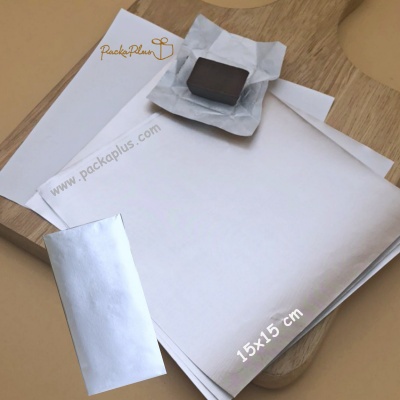 Aluminium foil+ paper แผ่นฟอยล์ 2 ด้าน -- ด้านหน้าเป็นเนื้อฟอยล์พรีเมี่ยม เนื้อหนาเรียบเนียน สีสวยกึ่งด้านกึ่งเงา ด้านหลังซับซ้อนกระดาษ คุณภาพ food grade ใช้สำหรับห่อ chocolate bar, powerball, energy bar, หมากฝรั่ง, บราวนี่ และ ขนมอื่นๆ 75g
