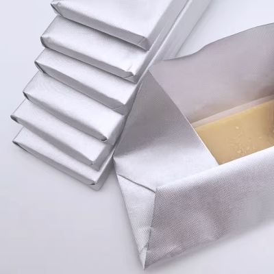 Aluminium foil+ paper แผ่นฟอยล์ 2 ด้าน -- ด้านหน้าเป็นเนื้อฟอยล์พรีเมี่ยม เนื้อหนาเรียบเนียน สีสวยเงาวาว ด้านหลังซับซ้อนกระดาษ คุณภาพ food grade ใช้สำหรับห่อ chocolate bar, powerball, energy bar, หมากฝรั่ง, บราวนี่ และ ขนมอื่นๆ 75g